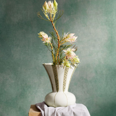 Inspired by the beauty of nature, the Kahler Signature Vase represents thoughtful Danish design by Meyer Lavigne. This innovative stoneware pottery piece features a distinctive floral funnel shape with a removable ceramic plate perforated like a lotus seed stand, allowing for creative flower arrangement. The elegant moss green stripes on the lower portion gracefully transition to wider stripes adorned with black dots above, creating visual interest while maintaining a sophisticated aesthetic. Perfect for both contemporary and modern interiors, this versatile artistic vase accommodates both artfully arranged stems and classic bouquets for unique home decoration.