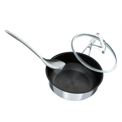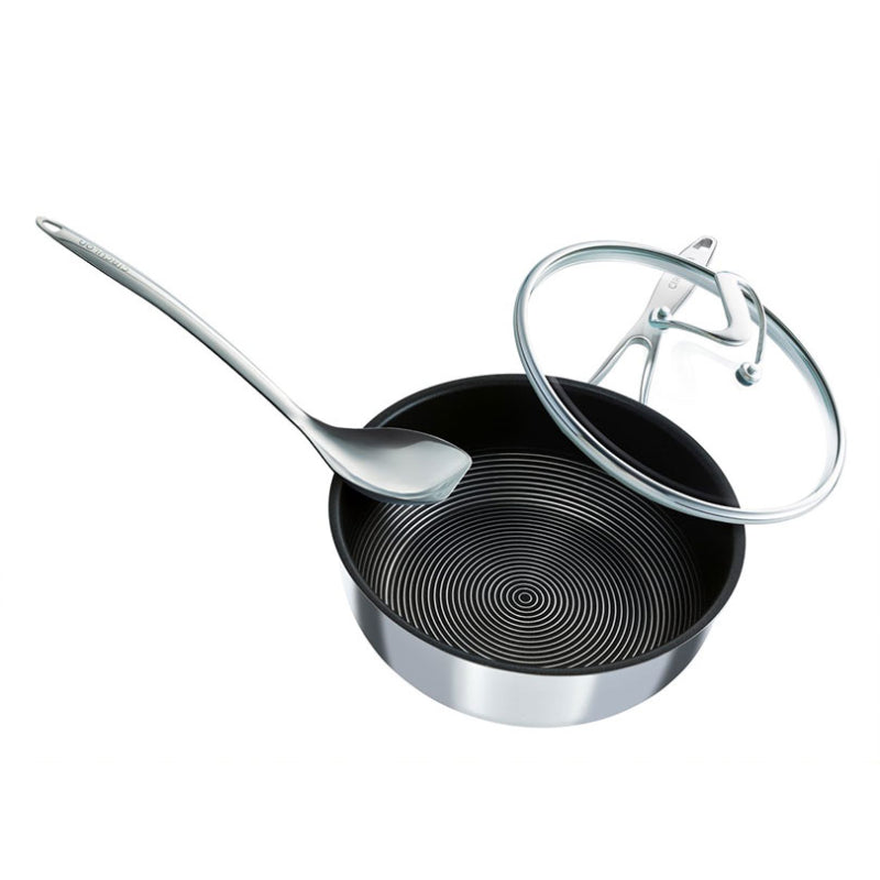 This durable stainless steel chef pan features an innovative SteelShield surface with protective steel peaks and non-stick grooves, ideal for everyday cooking. Complete with a metal scraping spoon to help you make the most of its hybrid design.