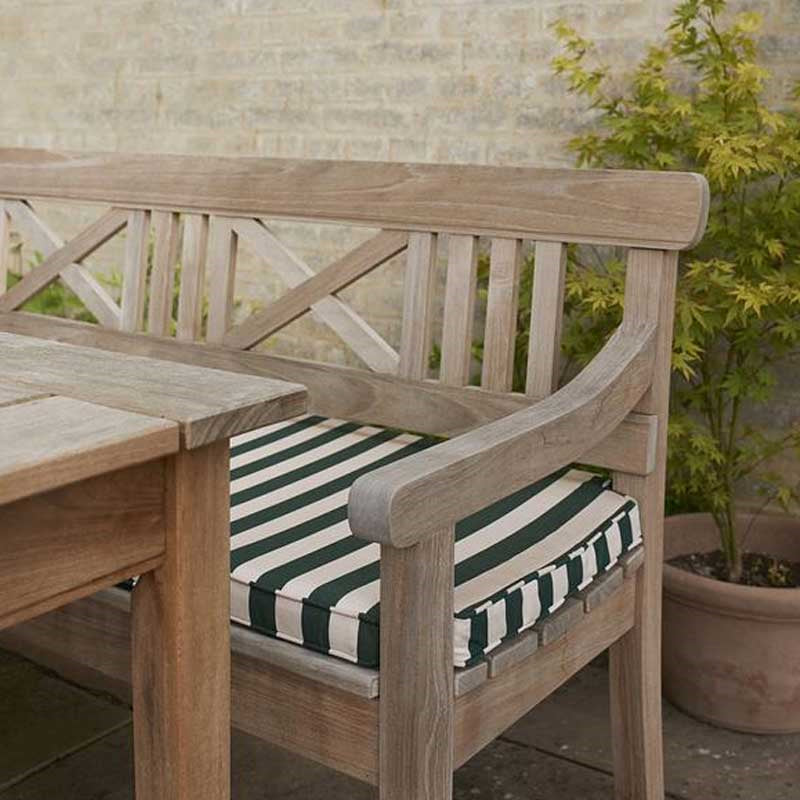 A custom-made garden cushion for the Drachmann Bench, featuring light apricot and dark green stripes. The waterproof design combines comfort with practicality, making it ideal for your outdoor furniture.