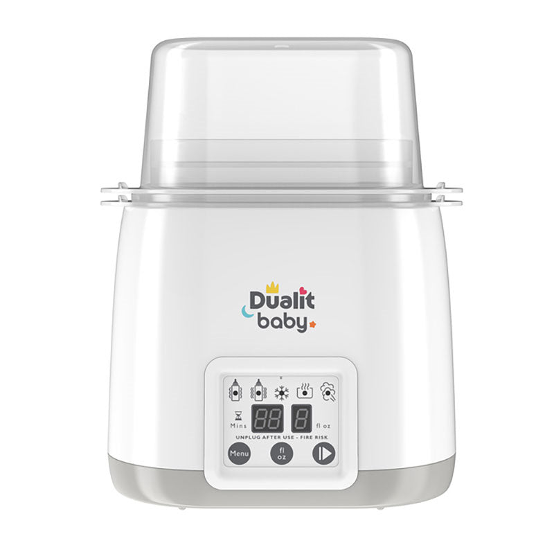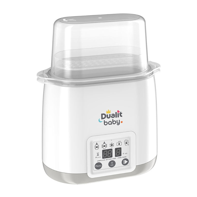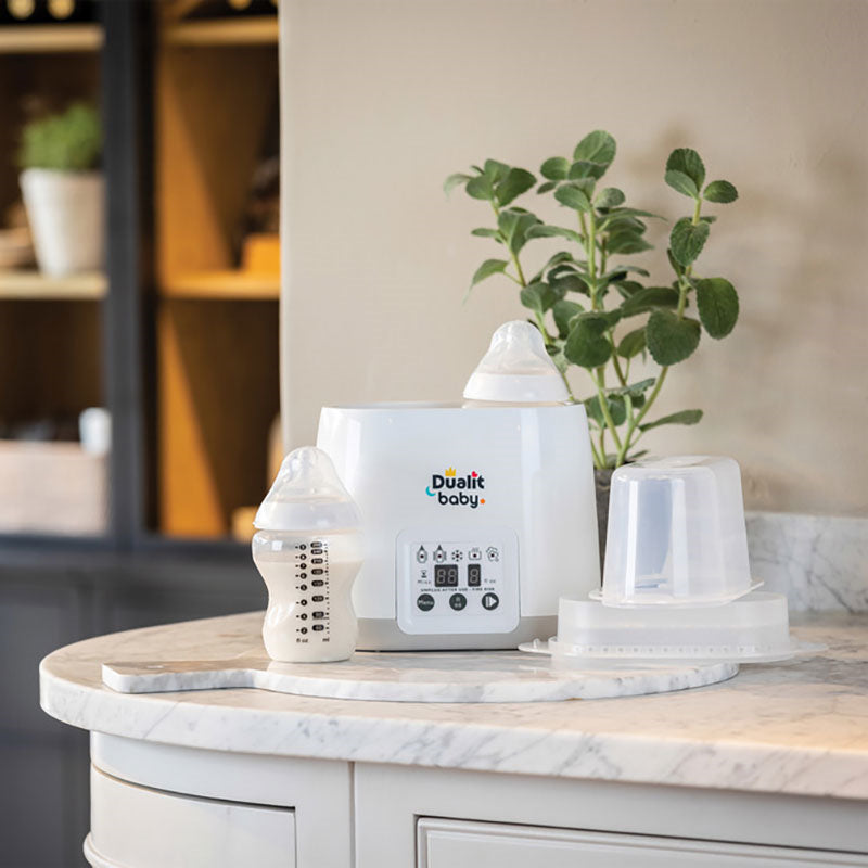 Dualit's Double Bottle Warmer offers a simple, multi-function design for warming, defrosting, and sterilising baby formula, food, and breast milk. The electronic control panel ensures optimal temperatures, while the sterilising function eliminates 99.9% of harmful bacteria, keeping bottles sterile for up to 24 hours with the lid closed. A practical and stylish addition to any kitchen. Ideal for milk warming, defrosting, food warming, sterilising.