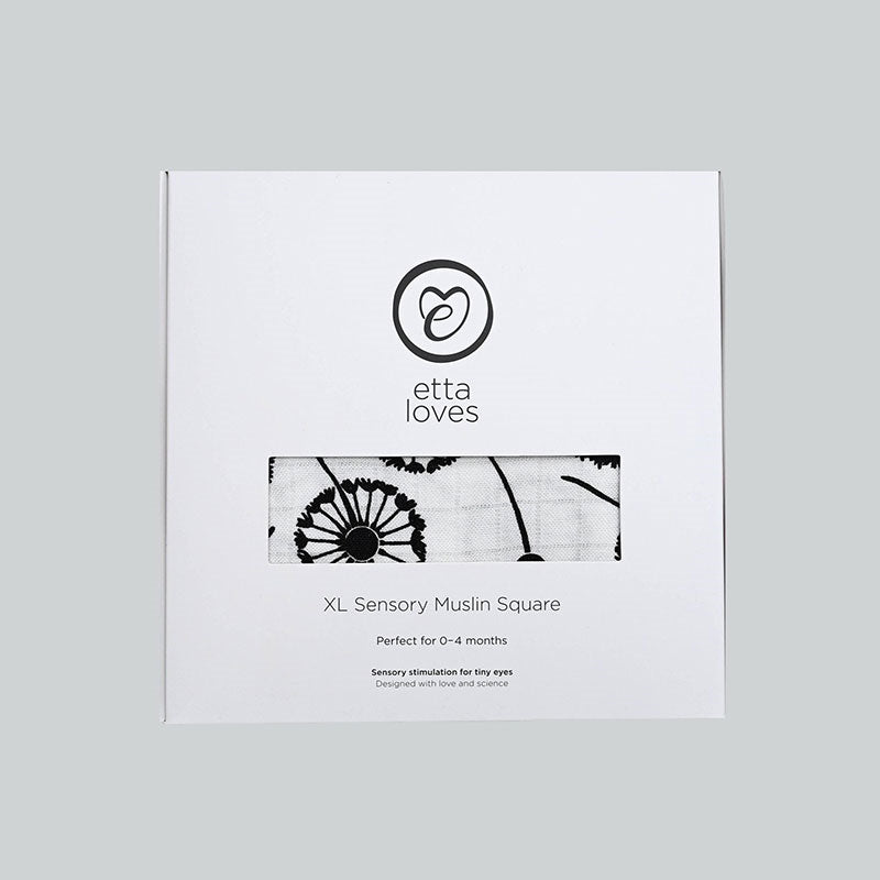An XL 120cm x 120cm muslin square in high-contrast black-and-white dandelion print, designed with orthoptists to support babies' visual and cognitive development from birth to around four months. Soft and versatile, it's perfect for cuddles, breastfeeding, tummy time, spillages, or as a car window shade for calm journeys.