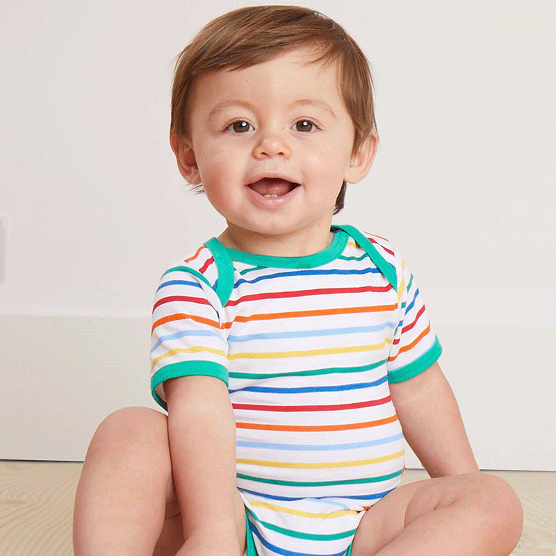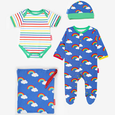 This new baby gift set featues a colourful cloud rainbow print. This set contains a collection of baby must-haves: Cosy toes sleepsuit, baby hat, drawstring bag and a complementary stripy baby body - all in soft organic cotton.