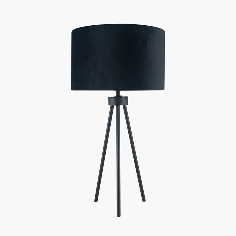 The Houston Tripod Table Lamp draws inspiration from minimalist design principles, combining sleek metal lines with luxurious textural elements. Slim tripod legs support a sophisticated black velvet shade lined with matching faux cotton, creating a balance of contemporary structure and soft illumination. Perfect for side tables, desks, or bedside placement, this elegant light stand adds refined character to modern and transitional interiors.