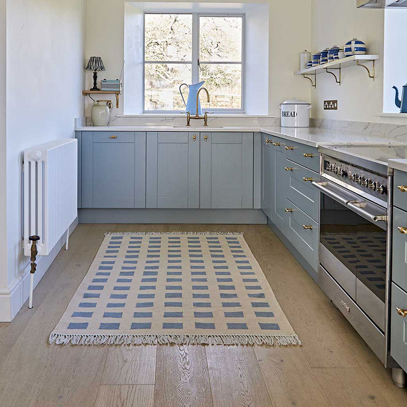 Weaver Green's Faro Rug draws inspiration from antique Swedish design, featuring a simple geometric pattern in soothing sky blue and ecru tones. Hand-loomed using refined recycled plastic yarn, this versatile floor area rug offers exceptional softness and durability while maintaining an elegant profile. Perfect for both indoor and outdoor spaces, it combines traditional craftsmanship with practical functionality for modern living.