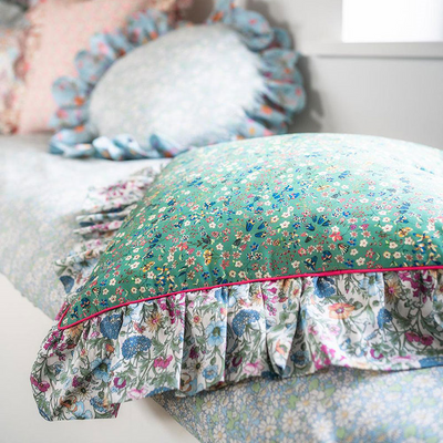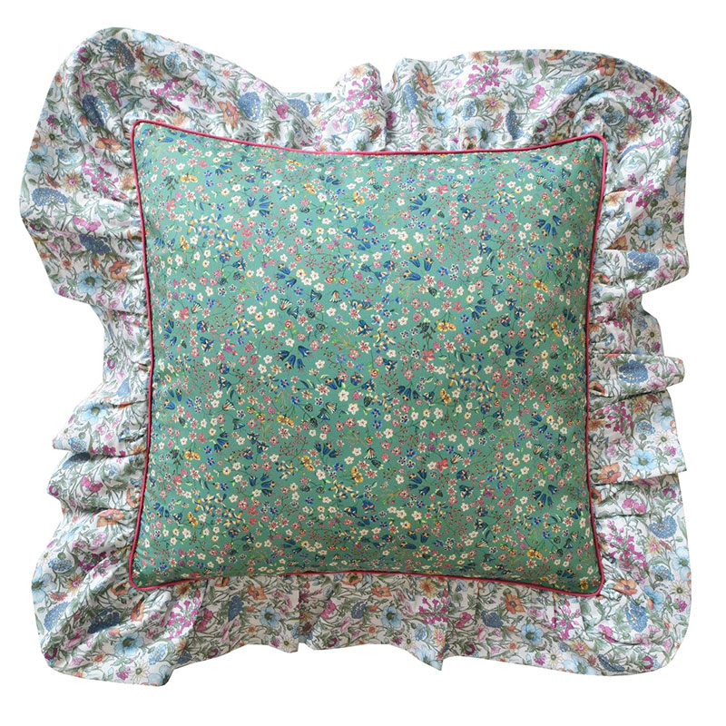 Coco & Wolf's Donna Leigh Ruffle Piped Cushion combines traditional craftsmanship with contemporary design sensibilities. Crafted from luxurious Liberty print Tana Lawn cotton on both front and back, this square-shaped scatter cushion features delicate ruffle detailing and elegant piping in a rich green hue. Its versatile 40cm profile makes it the perfect stylish decorative accent for sofas, armchairs, or bedroom settings, adding texture and visual interest to any home interior scheme.