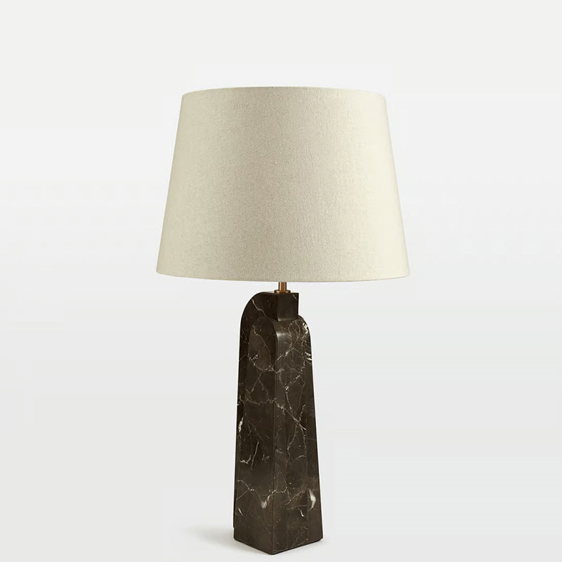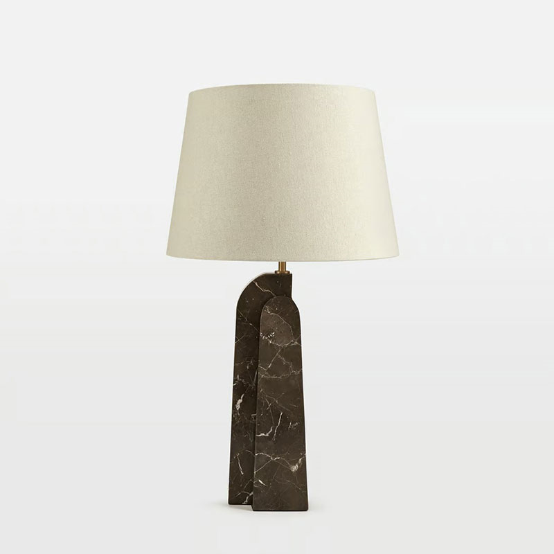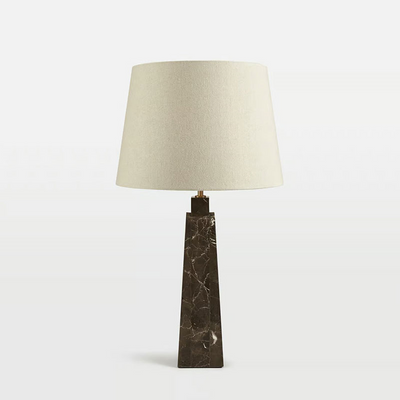 Soho Home's designer Darcy Table Lamp showcases sculptural design inspiration with its base crafted from three brown marble panels, each with natural variations that ensure uniqueness. Topped with a lined natural linen shade and finished with antique brass accents, this stylish piece balances visual interest with warm, ambient illumination. Perfect for bedside tables or living spaces, it introduces subtle texture and sophisticated lighting to any luxury interior decor.