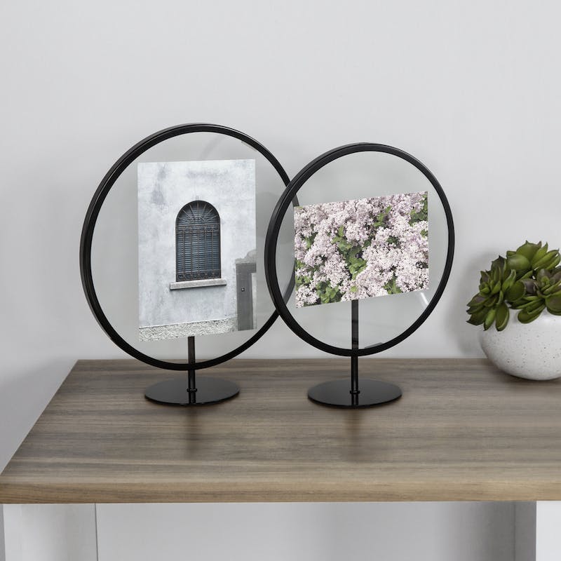 Regular price £25.00 Sale price £20.00 Save 20%Often times, it is difficult to find a picture frame that is both dynamic and a non-traditional rectangular shape. Bring your photos to life by displaying them in this incredibly unique floating picture frame from Umbra.. Introducing INFINITY from Umbra. INFINITY is an eye-catching picture frame that floats your photo between two panes of glass, while adding a new dimension to your space with its circular shape. This photo frame can be freestanding or wall-mounted to showcase your favorite photos or prints in a modern and elegant way. With the Infinity floating picture frame you can display your favorite 4x6 or 5x7 art pieces, pictures, illustrations and more. Available in 3 elegant finishes, this picture frame is sure to add a modern and sophisticated touch to your space. This floating frame can also be used as wall décor to create a visually engaging display. Arrange multiple Infinity frames to create a beautiful layered gallery wall effect. Use your imagination to mix and match the different sizes and finishes of this picture frame to display a beautiful array of illustrations or personal pictures on your tables or walls. Add this stunningly unique photo frame to your home today! About Umbra: A global product design company providing original, modern, casual and functional design for the home.
