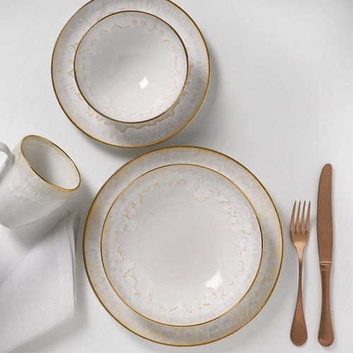 Refine your dining experience with Casafina's Taormina soup/pasta plates, where Mediterranean inspiration meets artisanal craftsmanship. Handmade in Portugal from fine stoneware, these white plates feature soft organic shapes with a stunning reactive glaze border and delicate handpainted gold edge, bringing a touch of understated luxury to everyday meals while maintaining a fresh, cheerful aesthetic.