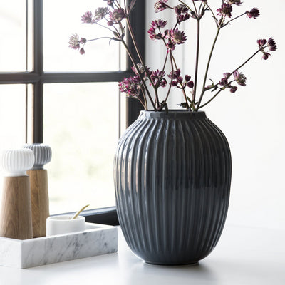 Kahler's Hammershøi Vase draws inspiration from classic Scandinavian designer design, featuring distinctive furrows that have become beloved in contemporary homes. The elegant decorative ceramic piece showcases a refined collar around the neck that, together with its harmonious grooves, creates a sophisticated silhouette that complements floral arrangements. In rich anthracite, this large statement vase merges timeless craftsmanship with modern functionality, becoming both a vessel for fresh flower blooms and a striking sculptural element when standing alone.