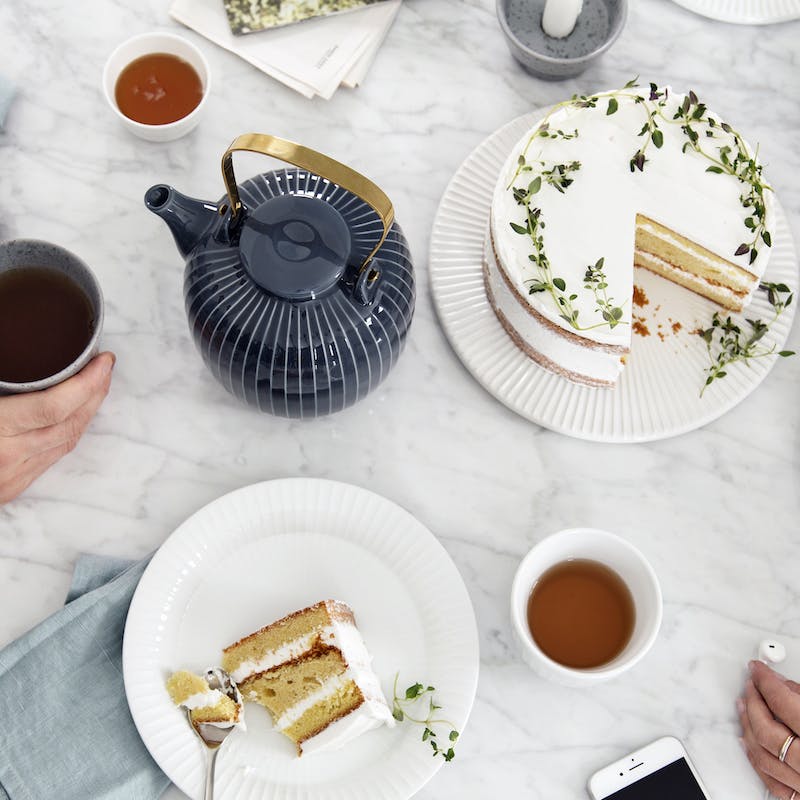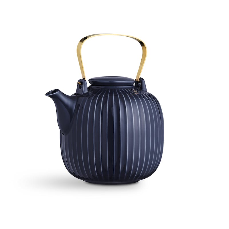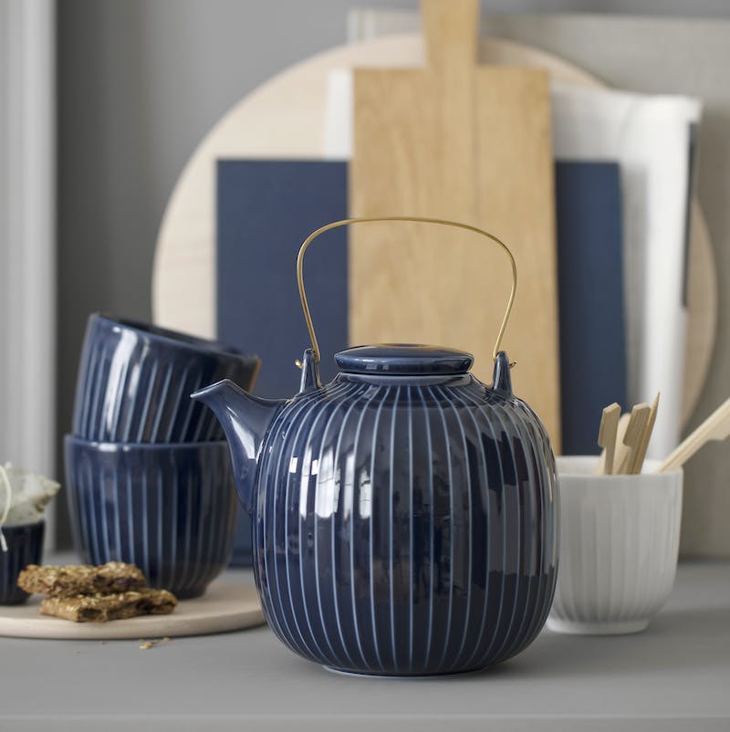 The beautiful Hammershøi teapot has an elegant, modern idiom with a decorative, brass-coated handle and a practical built-in strainer, which easily separates the tea leaves from the tea. Invite your guests to cosy up with a cup of tea and let the stylish indigo colour adorn your tea table. Width: 145mm | Height: 150mm | Volume: 1,2L Wash the ceramic products by hand, using a mild detergent.