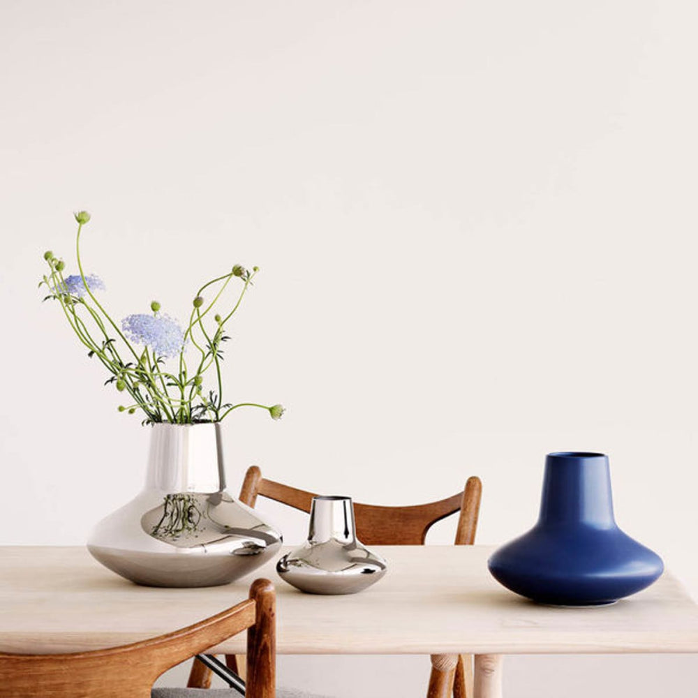The Koppel Large Vase draws inspiration from legendary Danish designer Henning Koppel's original archived works, reimagined with contemporary sensibility. Crafted from mirror-polished stainless steel, its fluid lines and minimalist silhouette exemplify the perfect reconciliation of form and function that defined Koppel's design philosophy. This elegant Georg Jensen piece serves as both a striking standalone sculptural element and a sophisticated vessel for displaying flower arrangements, creating a unique ornamental focal point for any stylish home.