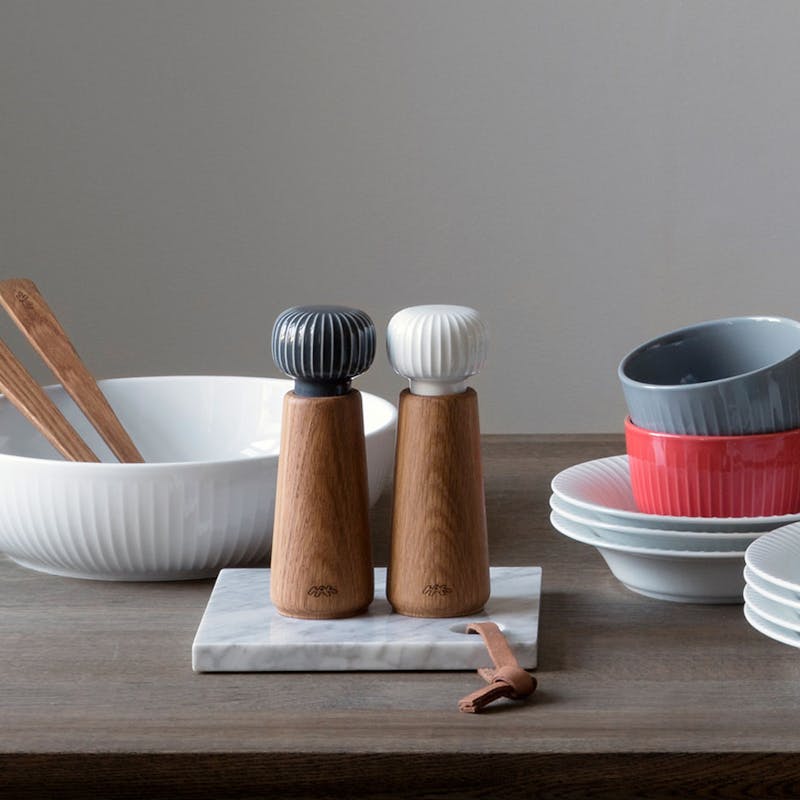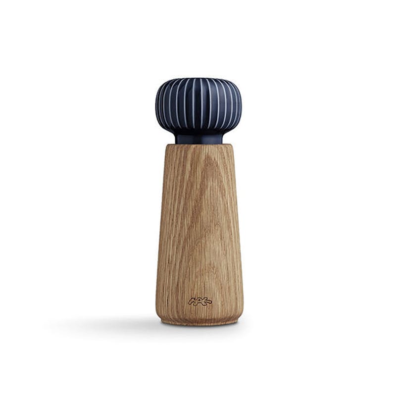 Designed by Hans-Christian Bauer for Kähler, this spice mill is made of oak and its ceramic top is adorned with simple vertical furrows in an indigo colourway. Beautiful in contrast, it makes a timeless piece that is perfect for both everyday use and festive table settings.
